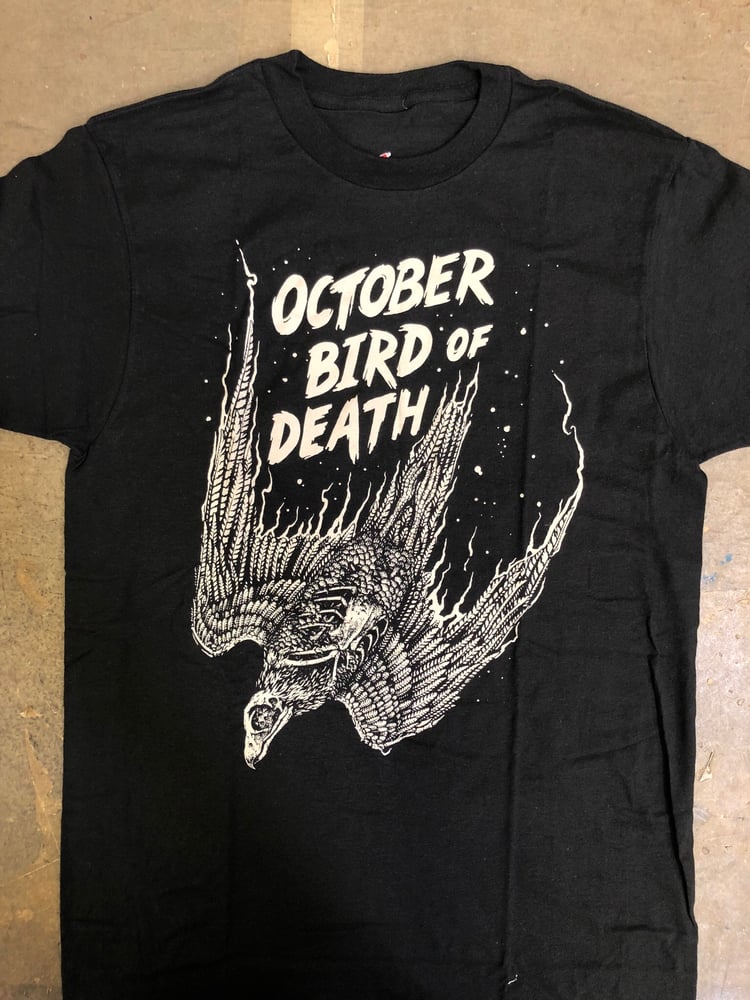 October Bird of Death logo t-shirt in mens and womens sizes. This is a soft ringspun cotton t-shirt using discharge inks so that the print feels like it is part of the fabric.